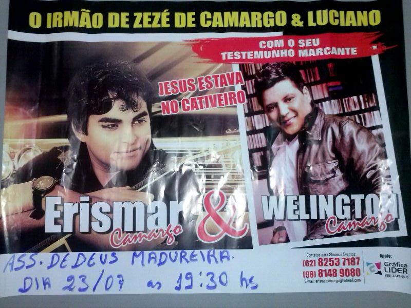 Com o seu testemunho marcante, o irmão Welinghton Camargo, irmão da dupla de cantores sertanejos Zezé de Camargo e Luciano estará hoje a noite, quarta-feira, 23, ministrando a Palavra de Deus durante cruzada evangelística realizada pela Igreja Assembleia de Deus ministério de Madureira, liderada pelo pastor Wilson Moisés da Rocha. O evento acontecerá em frente ao templo, na Avenida Dom Orione, setor Nova Araguatins.